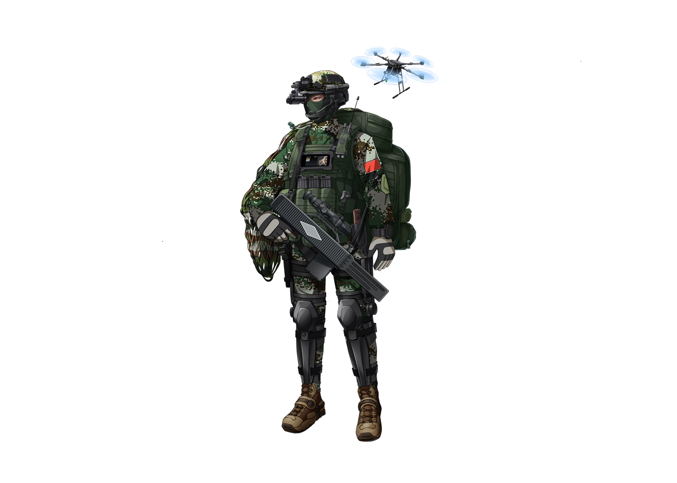 Delineamos soluções personalizadas de “Guerreiro do Futuro” para nossos clientes que integram equipamentos e tecnologia de ponta, visando garantir a sobrevivência dos soldados e buscar maior capacidade de combate para preencher os requisitos de futuro campo de batalha. A solução inclui equipamentos avançados como uniformes de camuflagem, capacetes e coletes à prova de balas, chapéus militares, luvas, botas de combate, cintos militares, mochilas de hidratação, mochilas tácticas, sacos de dormir, cobertores, dispositivos de visão noturna, terminais inteligentes, lanternas tácticas, equipamentos de rádio, equipamentos de reconhecimento/ataque não tripulados, equipamentos de interferência e contramedidas contra veículos aéreos não tripulados, relógios militares, redes de camuflagem multifuncionais, sistemas de exoesqueleto, etc. Pode ainda ser equipada com dispositivos militares de comunicação, equipamentos optoeletrónicos, radar, plataformas de combate não tripulados, terminais inteligentes, etc., para melhorar a consciência situacional do campo de batalha e alcançar a tomada de decisão e comando de ataques eficientes.